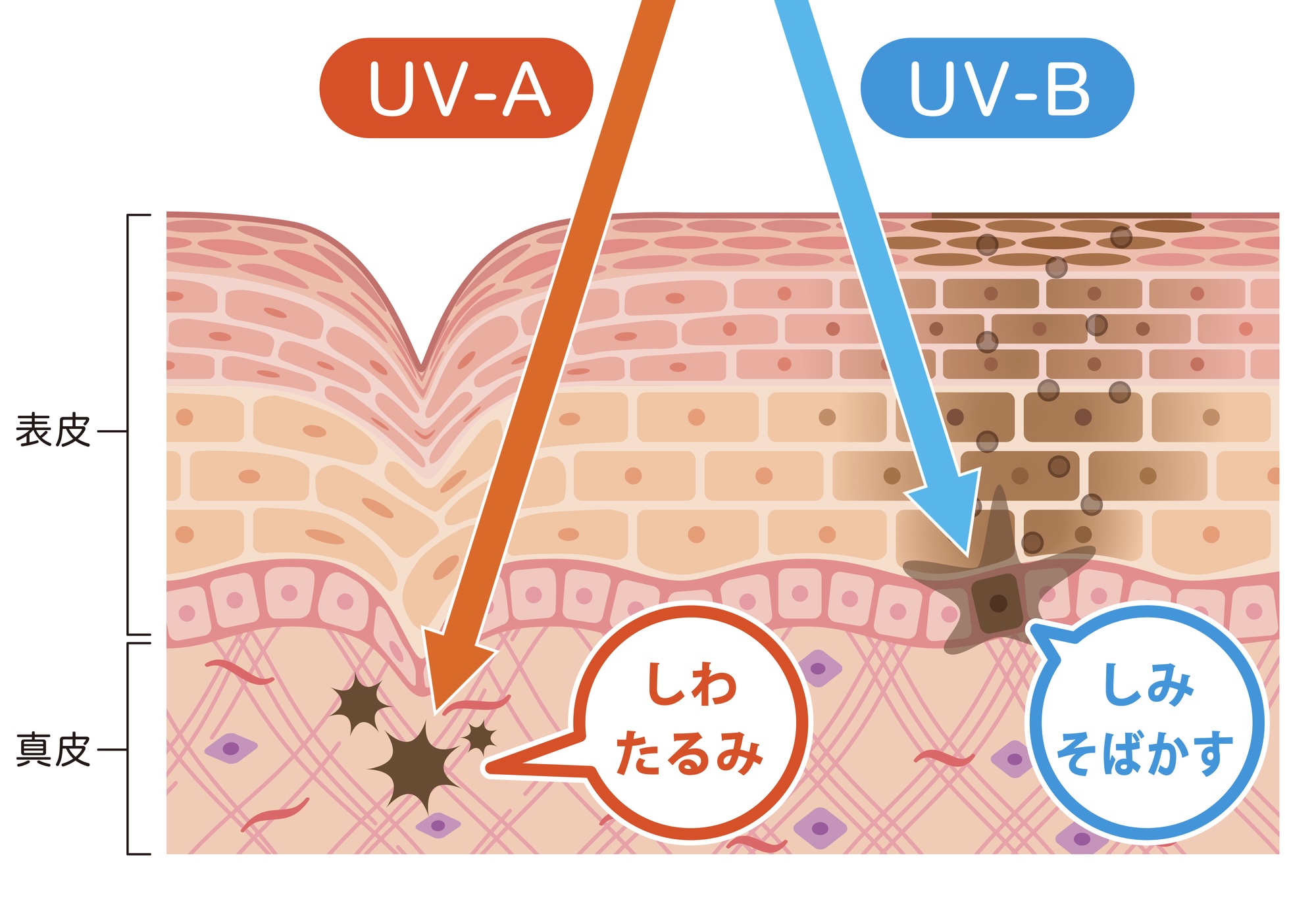 たるみ毛穴を防ぐのに気をつけるのは、肌の老化を進めてしまう”紫外線”です。特に紫外線A波はコラーゲン・エラスチン・ヒアルロン酸がある真皮層(肌の土台となる部分)を破壊し、たるみを引き起こすことになります。