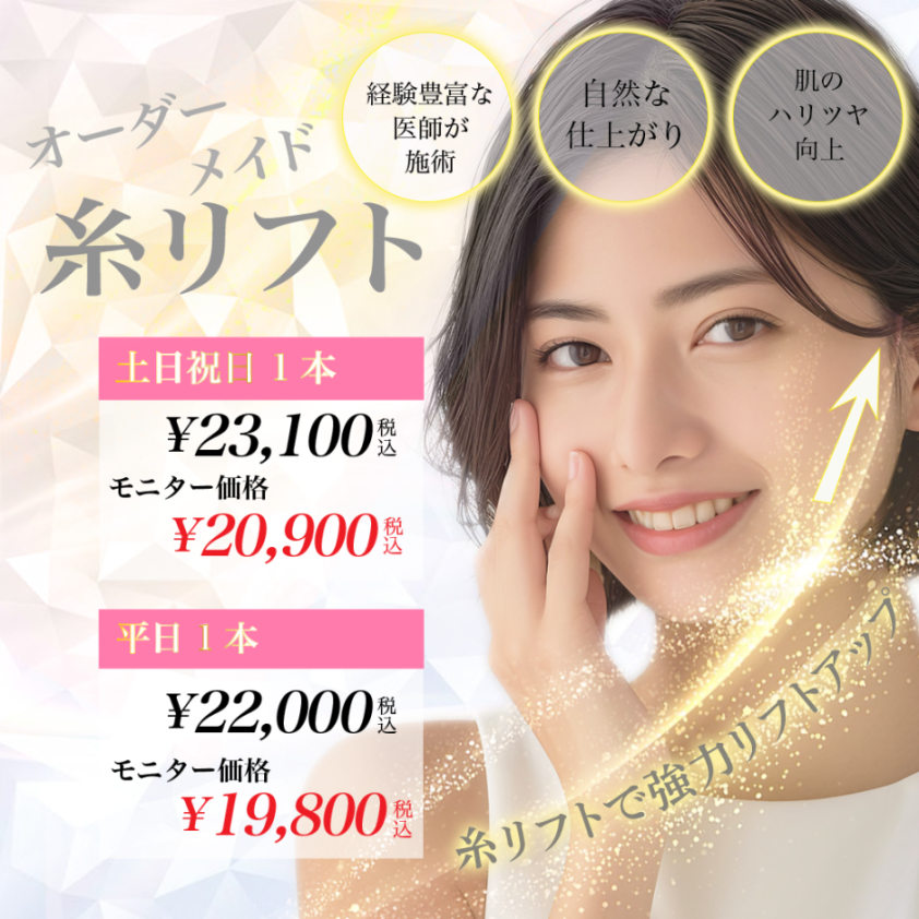 | 副作用情報 | 施術後、腫れや痛み、内出血のほか、左右差、異物感、糸の露出、ひきつれ、凹凸、感染、化膿などの症状が起こる可能性がございます。 |